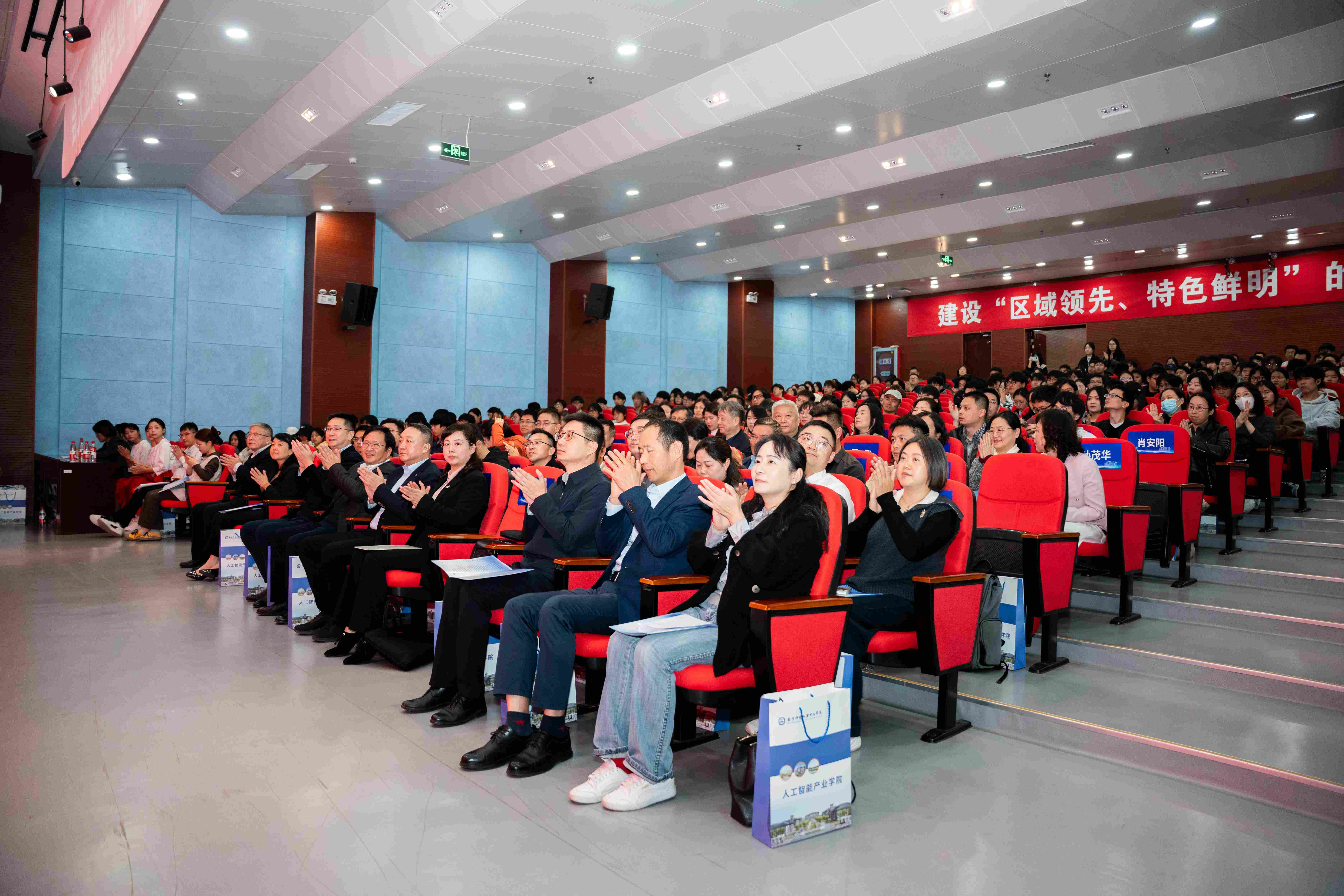 大会的核心环节——揭牌与授牌仪式,将现场气氛推向高潮。谢丰羽副市长、岳嵩副校长、戴传超院长与信息工程学院曲维光院长共同为“人工智能产业学院”揭牌,红色幕布落下的瞬间,全场掌声雷动。
