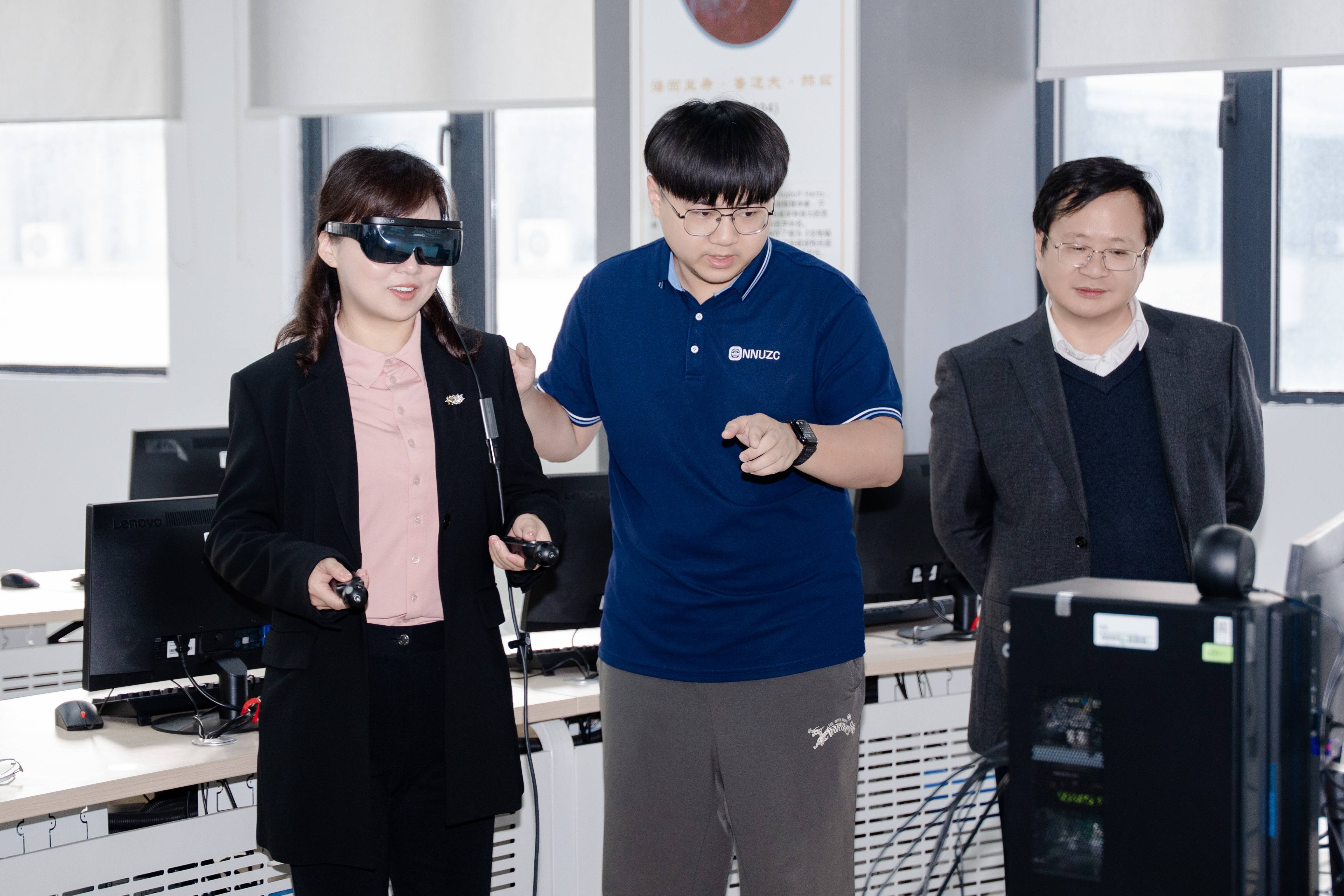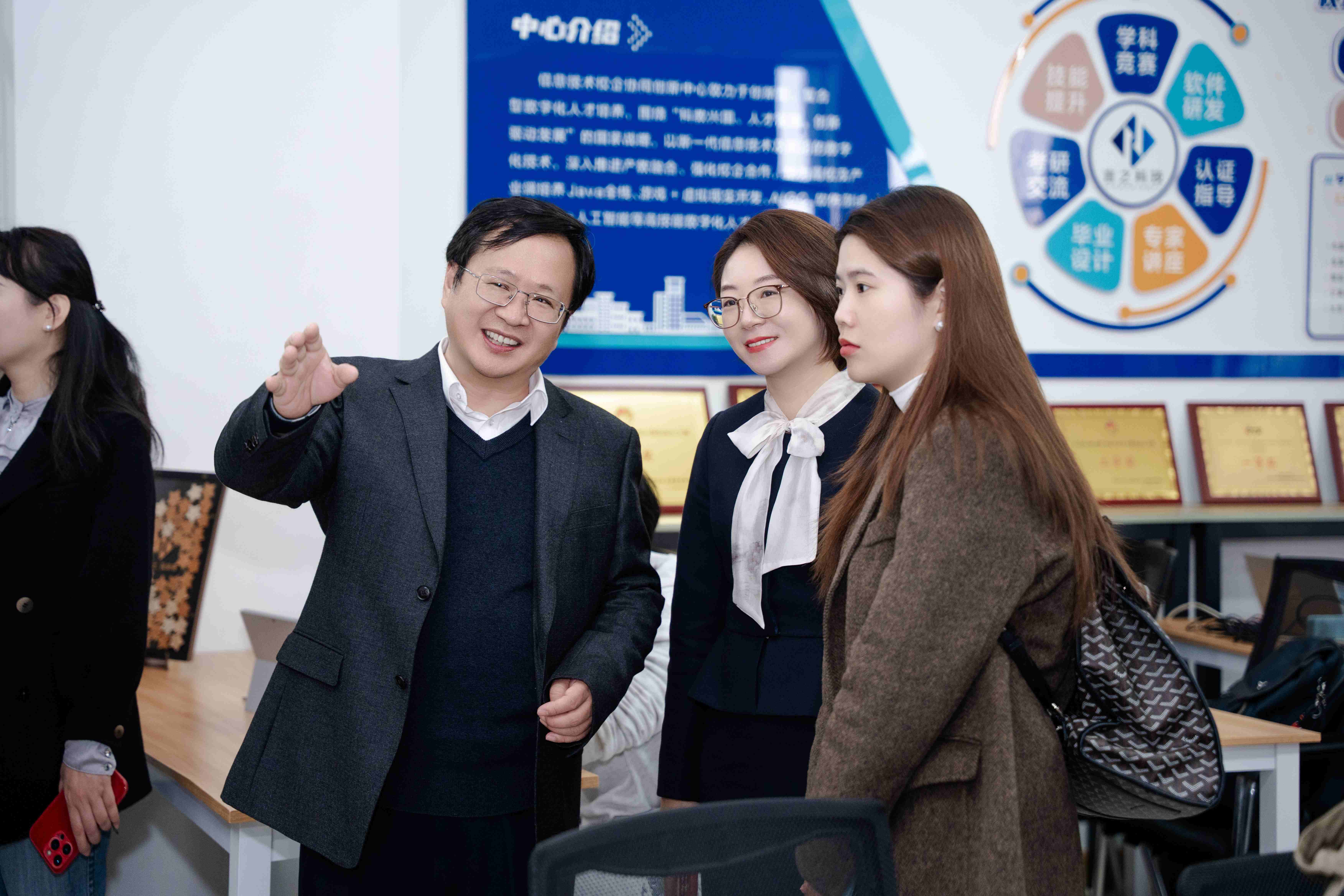 成立大会结束后,源本科技集团总经理唐佩和与会嘉宾集体参观了位于致理楼四楼的人工智能产业学院实践平台。戴传超院长在参观时强调:“这样的产学研合作项目要多搞,让学生全程参与,在实践中提升能力。”