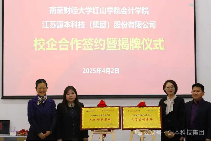 2025年4月2日,江苏源本科技(集团)股份有限公司与南京财经大学红山学院在高淳校区智园楼B124会议室隆重举行校企合作签约暨揭牌仪式。此次合作旨在深化产教融合校企合作,推动科技与财经教育的深度融合,促进交叉学科建设,共同培养具备智能财务、智慧金融等前沿技能的复合型人才。